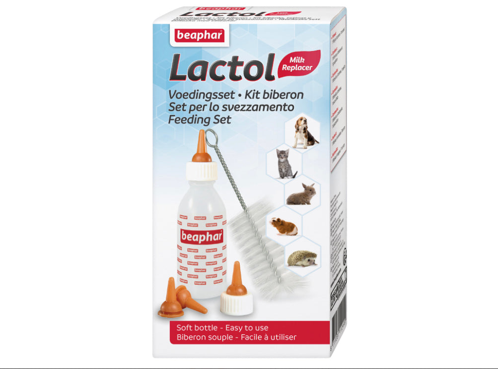 The Beaphar Lactol Feeding Set contains a feeding bottle, four teats and a cleaning brush. This bottle is designed for feeding newborn and growing animals (puppies, kittens, guinea pigs, rabbits, hedgehogs etc.)