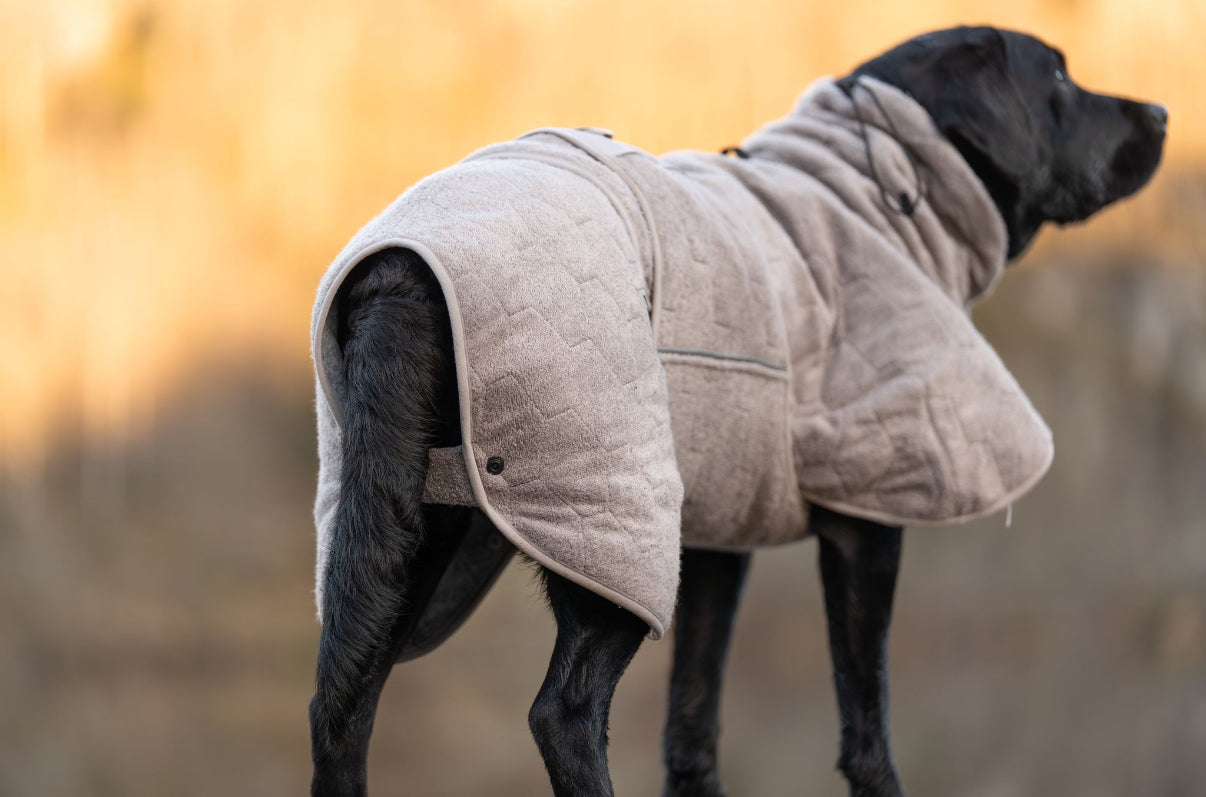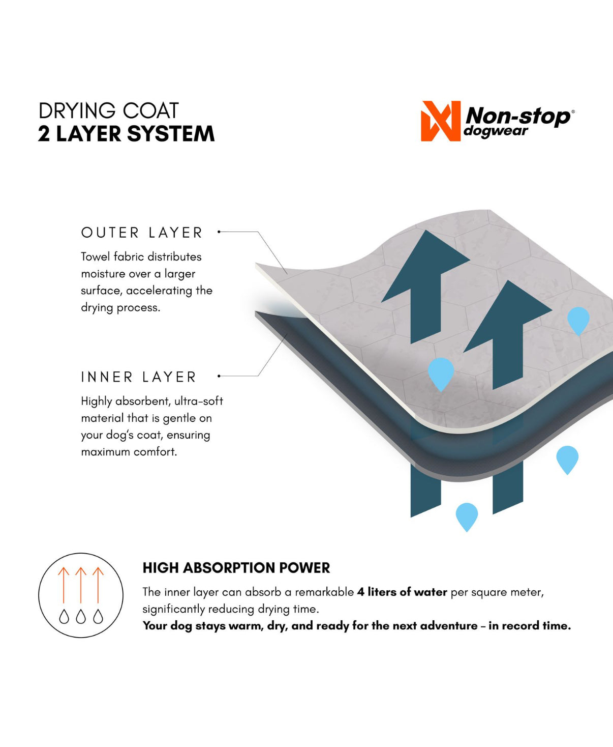 Myk og behagelig, tørkedekkenets design gir maksimal dekning samtidig som den gir hunden full bevegelsesfrihet. En utvidet nakke dekker hundens hode og ører. Justerbare benstropper, et feste bak og et omslagssystem med justerbar bryststropp sikrer en tettsittende passform samtidig som den holder dekkenet sikkert på plass.