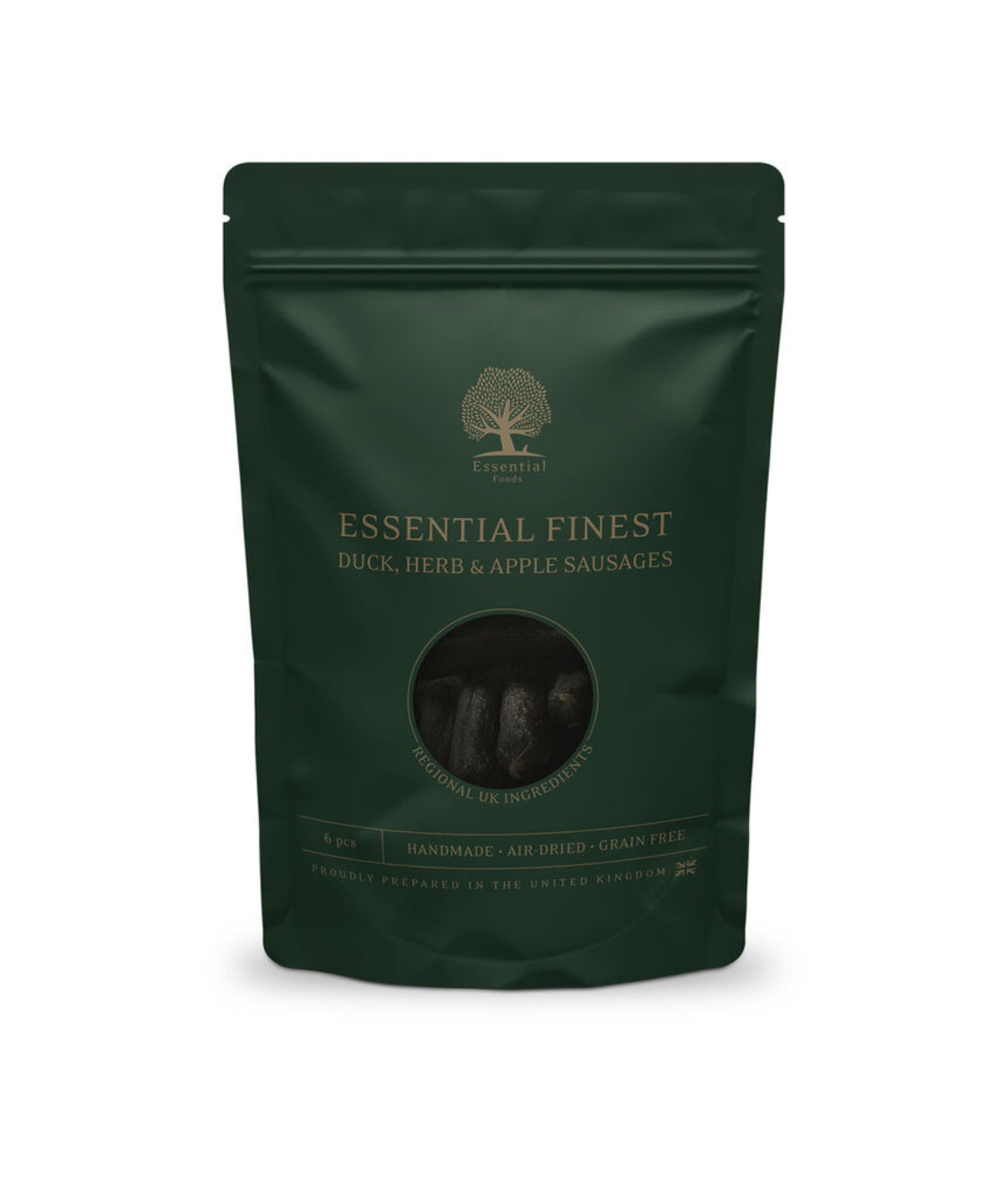 Når kun det allerbedste er godt nok. ESSENTIALS FINEST er vores serie af luksus godbidder der matcher indholdet i vores måltider. Her som 6 større snack pølser tilberedt med and, urter og æble. Vanvittig lækker kombination som du ej selv kan holde snitterne fra. Tro os! Lufttørret og håndlavet a-z i England.