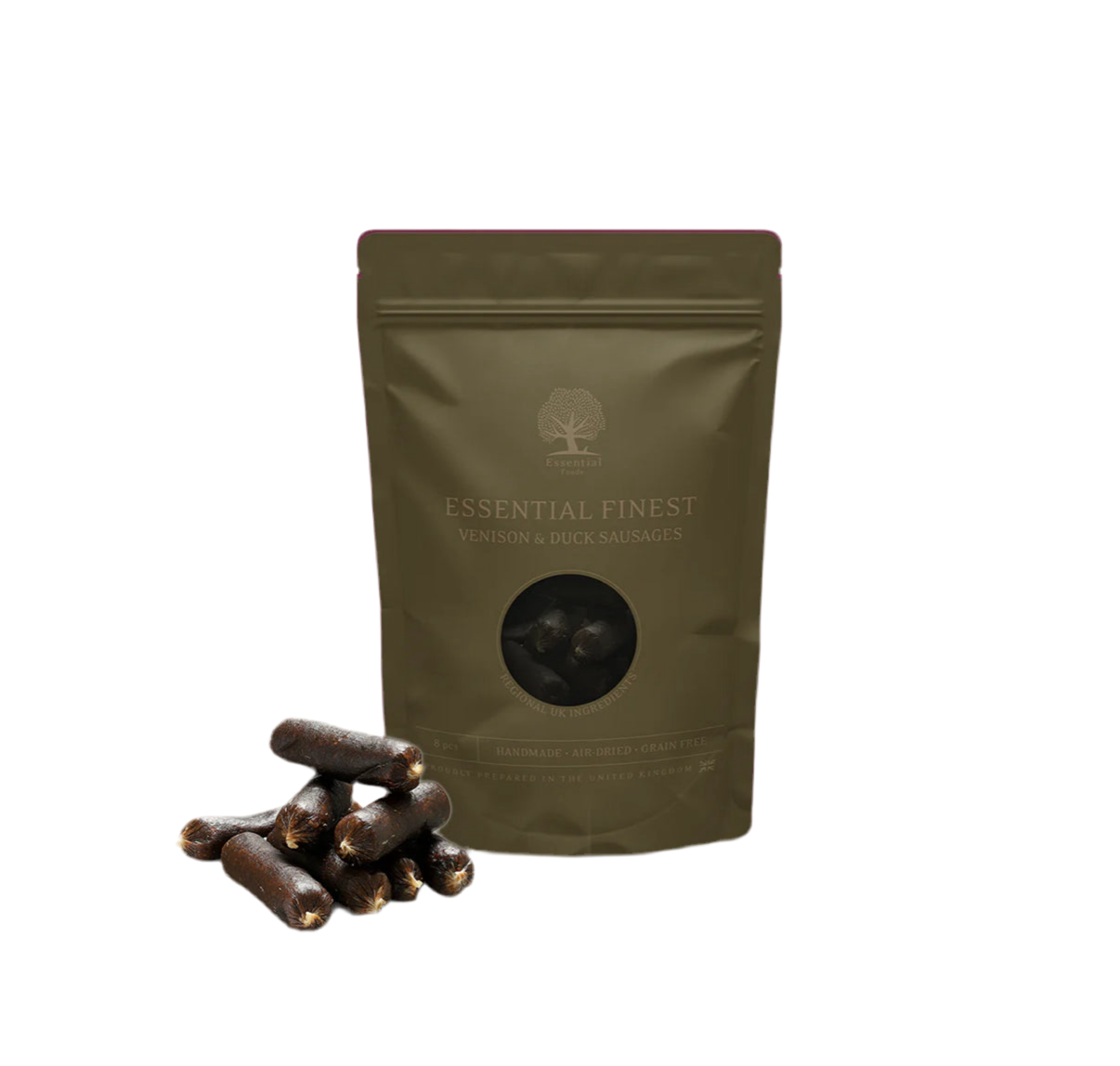 Når kun det allerbedste er godt nok. ESSENTIALS FINEST er vores serie af luksus godbidder der matcher indholdet i vores måltider. Vanvittigt delikat, ja måske lidt for meget af det gode, men vi kan jo ikke lade være. Her som 8 snack pølser tilberedt med hjort og and. Lufttørret og håndlavet a-z i England.
