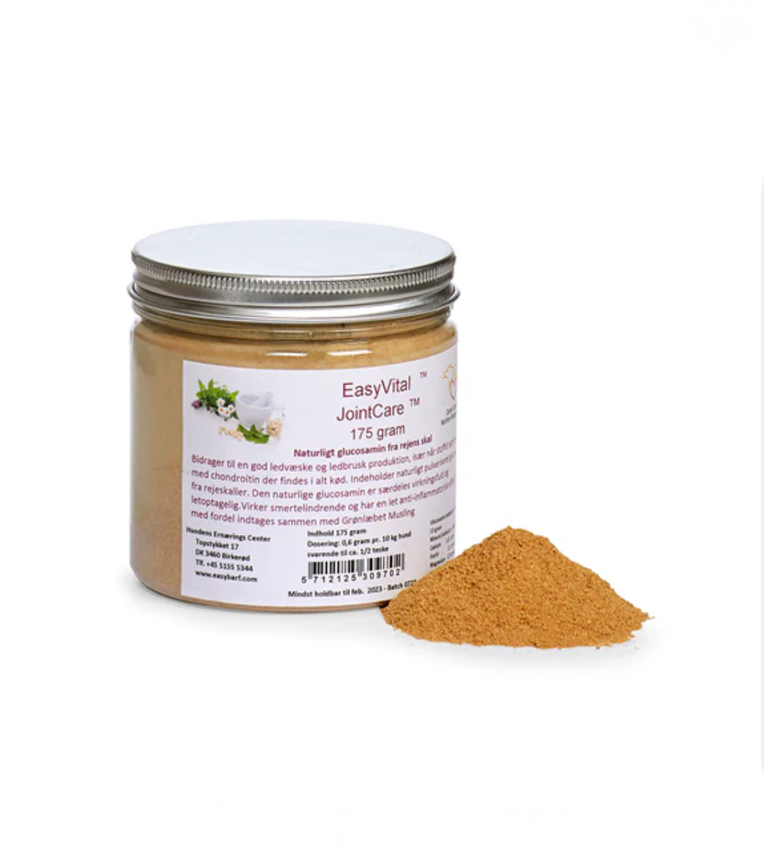 JointCare er et 100% naturligt glukosamin produkt, som bidrager til en god ledvæske- og ledbruskproduktion, hvorfor det med fordel kan gives til især voksne og seniorhunde.