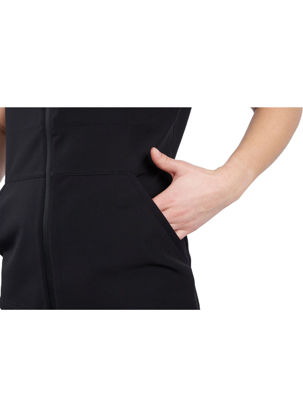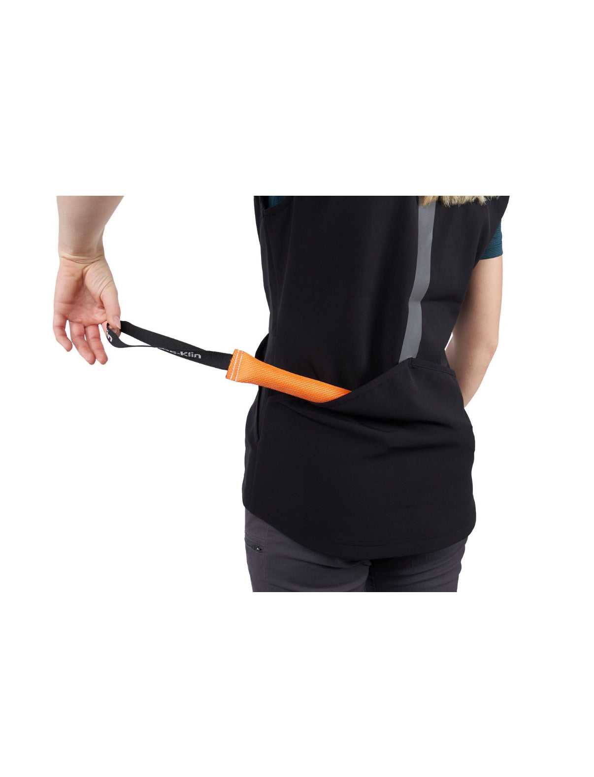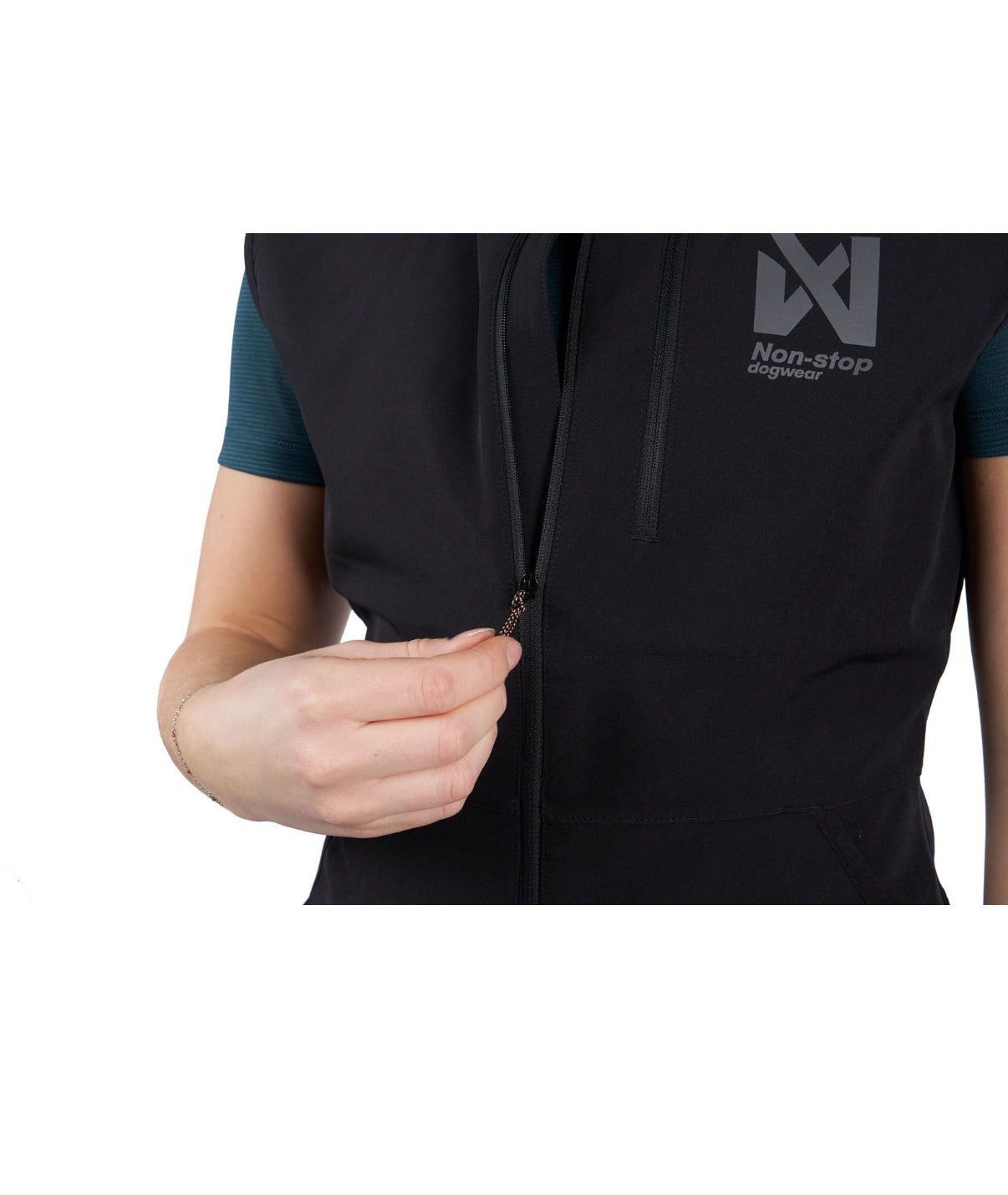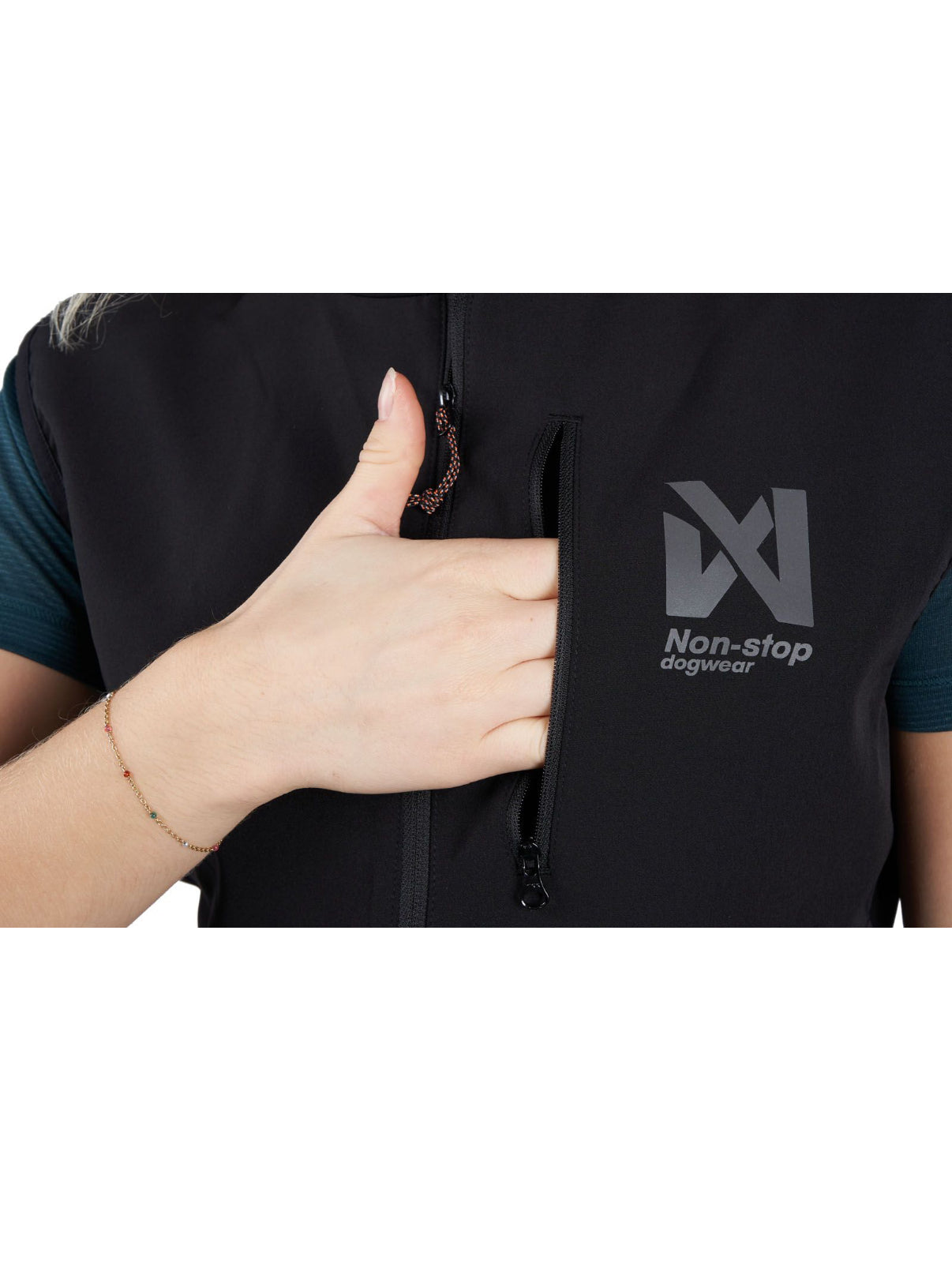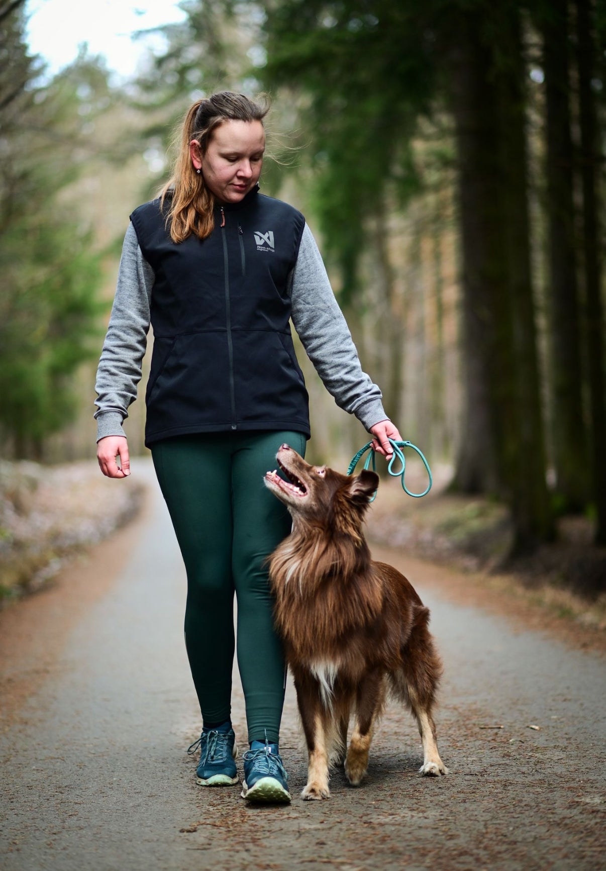 Vesten er laget av ultralett softshell-materiale, så lett at du knapt vil merke at du har den på deg. Den tilbyr viktige lommer som imøtekommer en hundeførers behov. Den store åpne lommen på baksiden gir god plass til baller, slepebåter og andre leker uten å sprette rundt når du går eller løper. To romslige frontlommer gir rask tilgang til godbiter og har tilbehørsløkker for å sikre små gjenstander som en fløyte, avfallsposedispenser eller bilnøkler. Brystlommen med glidelås gir et trygt sted for telefonen og andre verdisaker.
