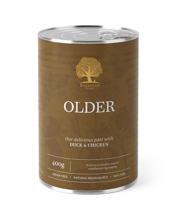 ESSENTIAL OLDER PÂTÉ er vores lækre paté med kødstykker af and og kylling skræddersyet til ældre hundes behov. Et fuldfoder måltid eller en velsmagende topping som støtter en mild fordøjelse - noget seniorer ofte sætter ekstra pris på.
