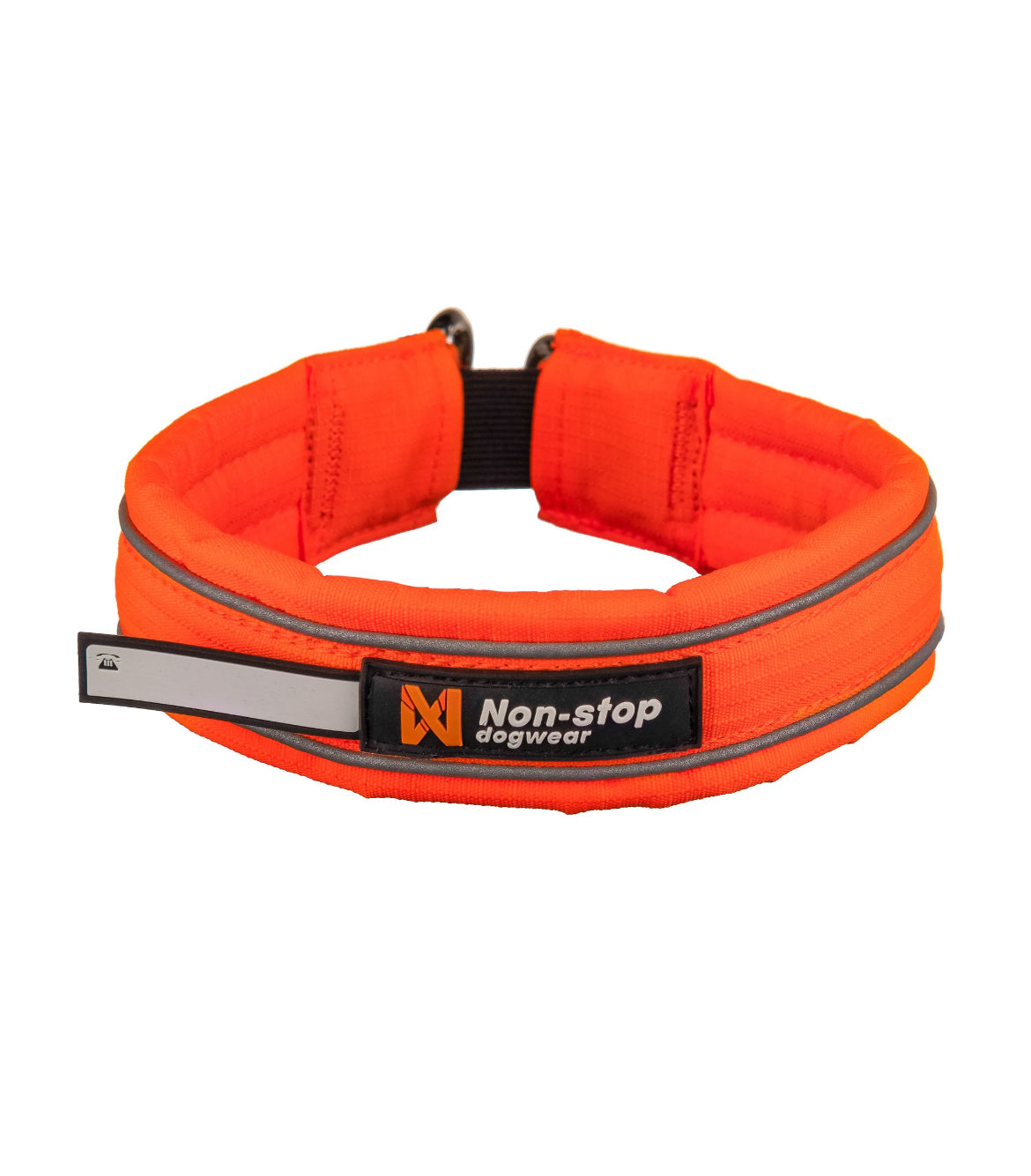 Non-stop dogwear Safe collar is a collar developed for dogs that are running free. The collar is made with a bungee component. If the dog gets stuck, the bungee component will break and your dog will get free.
