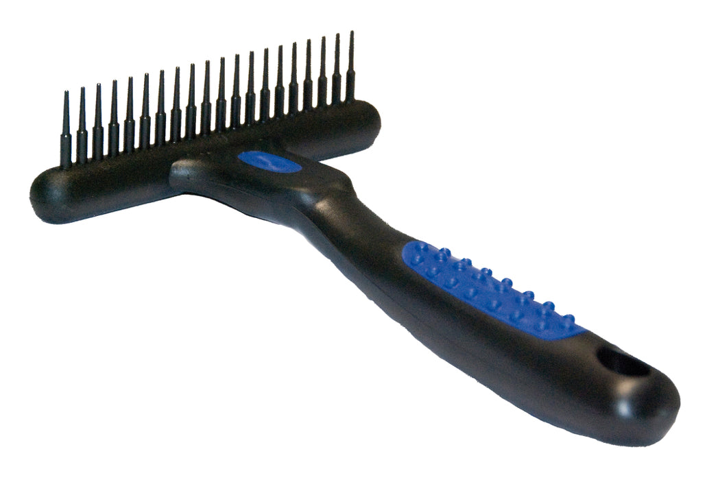 Specifically designed to remove undercoat and mats in dense coated breeds, helping to reduce shedding. Ergonomically designed T-style, non-slip handle to eliminate strain and fatigue on the hand and wrist. 20 anti-static metal pins glide smoothly through the coat.